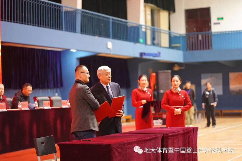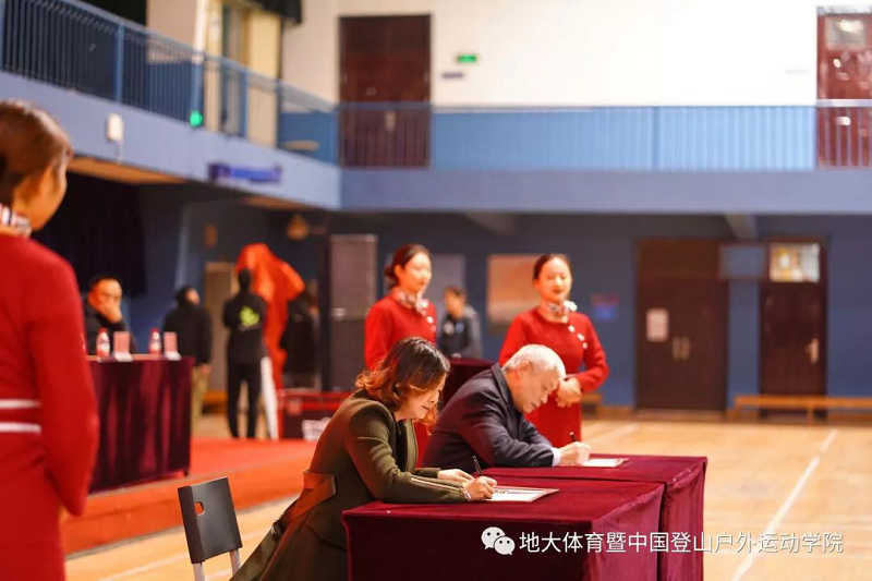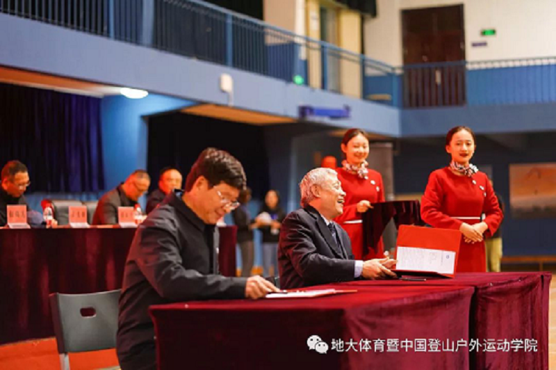 致辞完毕后,国家体育总局登山运动管理中心副主任、中国登山协会秘书长张志坚同志、中国地质大学(武汉)副校长傅安洲同志在现场共同签署了《中国登山户外运动学院共建协议》、《登山运动史料整理、利用合作协议》;