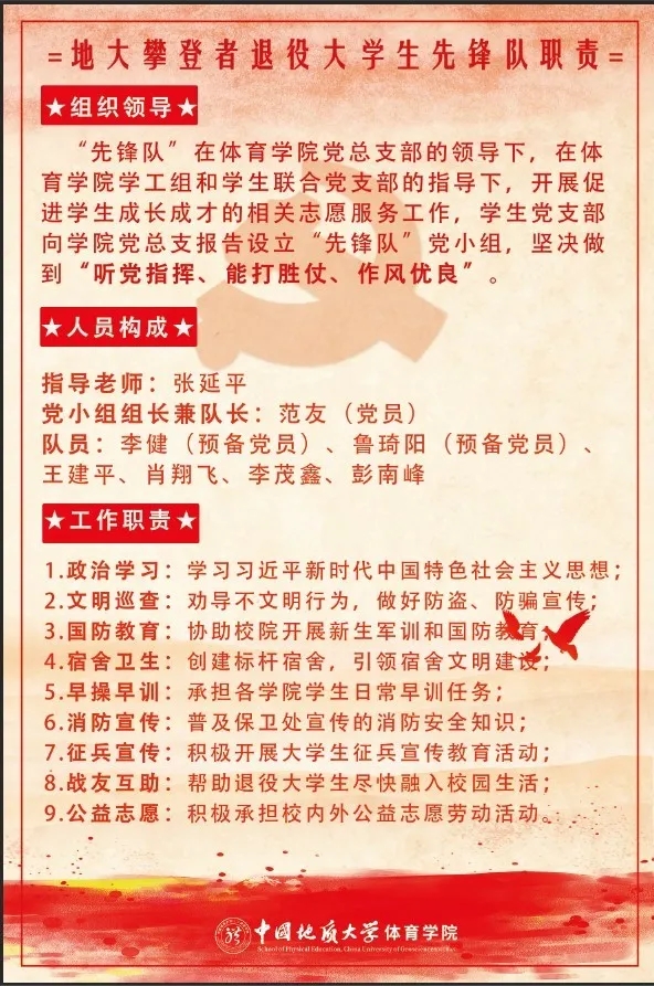 虽然这几名退役军人已经离开部队,但军人“退役不退色”,在taptap点点官方网站党总支的领导下,在学院学工组和学生联合党支部的指导下,开展促进学生成长成才的志愿服务工作。地大攀登者退役大学生先锋队的队员们要在理论武装、行为养成、学风建设、校园文明和国防教育等方面发挥标杆作用。