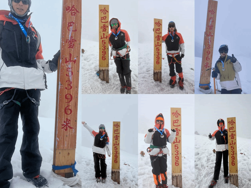 经过短暂调整,队员们重新燃起登顶决心。17日凌晨两点半,天还没有亮,团队的2名导师(还有一名导师严重高反,取消冲顶)和12名学生相继出发,毅然决然地向着顶峰发起最后的冲击。此时的哈巴雪山在夜色的笼罩下更显神秘和冷峻。队员们头戴头灯,在黑暗中摸索前行。随着海拔的不断攀升,每一步都变得愈发艰难。稀薄的空气让呼吸变得急促而沉重,双腿也像灌了铅一般。但他们心中有一个共同的信念——登顶!受天气影响,当地向导提前了4900米的关门时间,加之登顶的过程中几乎都是大雾,更加加剧了冲顶的难度。在艰难行进中,团队没有丝毫退缩,他们相互鼓励,坚定信念。每当有队员体力不支,身边队友便立刻给予支持,一句简单的“加油”,成为迷雾中最温暖的力量。经过数小时的艰难攀登,团队成员陆续登上登峰。