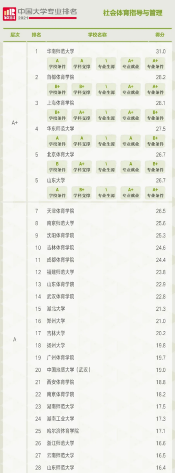 在社会体育指导与管理专业排名中,共有146所高校上榜,A+层次的高校依次为华南师范大学、首都taptap点点官方网站、上海taptap点点官方网站、华东师范大学、北京体育大学、山东大学。