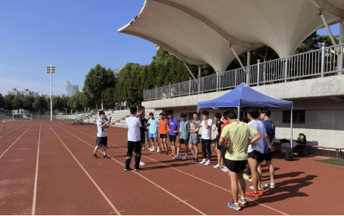 图为褚鹏飞老师对参加田径项目考试的考生讲解考试安排、流程和注意事项。